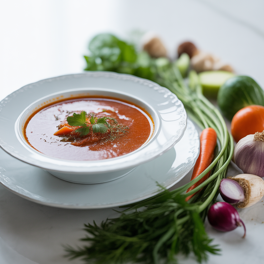 Сбалансированный, насыщенный вкус с доминирующей сладковатой нотой свеклы, кислинкой томата и глубоким мясным оттенком. Аромат с нотами душистого перца, чеснока и петрушки.