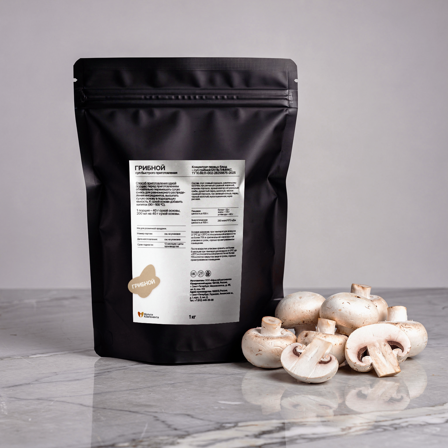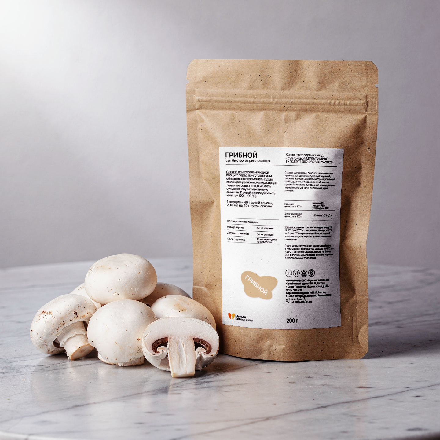 Сухая смесь на основе сушеных шампиньонов и овощей для быстрого приготовления грибного супа. Достаточно залить кипятком или немного проварить. Подходит как для легкого первого блюда, так и для густой грибной подливы или соуса.
